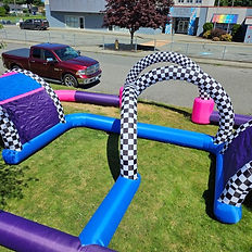 Race track with ball hoppers. Fun way to race your friends around this 10 m wide and 15 m long race track. 1 blower requires one 15A circuit. Deposit Information: 50% deposit due upon booking. Balance to be paid day of rental. Delivery Fee: will vary depending on location.